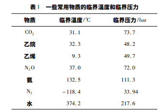 超臨界流體是指溫度處于其臨界溫度以上、且壓力處于 臨界壓力以上的流體。一些常用物質(zhì)的臨界溫度和臨界壓 力如表 1 所示。